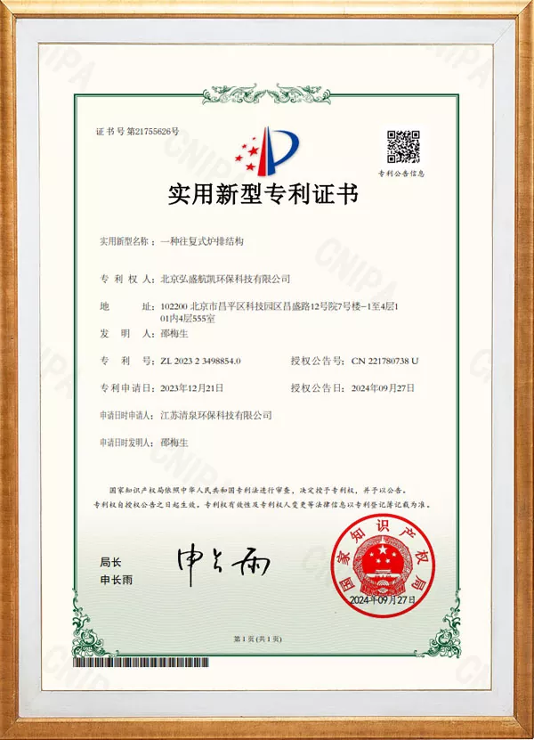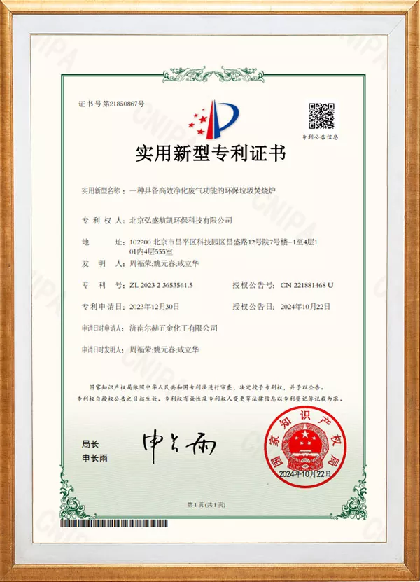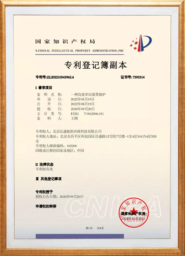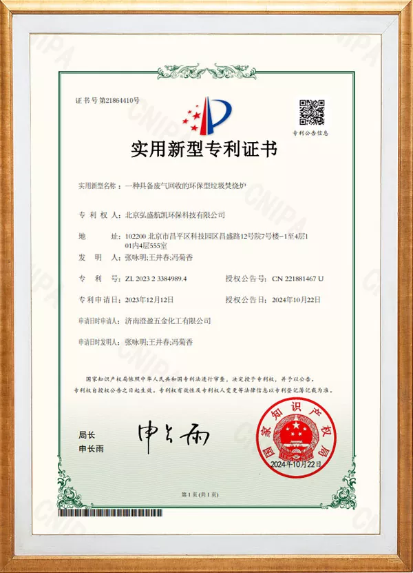 நிறுவனம் தீவிர ஆராய்ச்சி மற்றும் மேம்பாட்டுக்காக 9 ஆண்டுகள் மற்றும் 50 மில்லியனுக்கும் அதிகமான யுவான் செலவிட்டது, இப்போது 5 கண்டுபிடிப்புகள் மற்றும் 15 பயன்பாடு மற்றும் தோற்ற காப்புரிமைகள் உள்ளன, அவற்றில் பல சர்வதேச தொழில்நுட்ப தடைகளை வென்றுள்ளன. உள்நாட்டு கழிவுகளுக்கான மிகவும் திறமையான மற்றும் சுத்தமான எரியும் தொழில்நுட்பம் கழிவு எரியூட்டிகளின் செயல்பாட்டில் உருவாக்கப்பட்ட பல செயல்முறை சிக்கல்களை முற்றிலுமாக தீர்த்துக் கொண்டுள்ளது, மேலும் எங்கள் நிறுவனம் கொதிகலன் மாற்றத்தில் பல காப்புரிமை பெற்ற தொழில்நுட்பங்களையும் கொண்டுள்ளது, இது எதிர்கால கழிவு சிகிச்சைக்கு ஒரு புதிய பாதையை உருவாக்குகிறது.